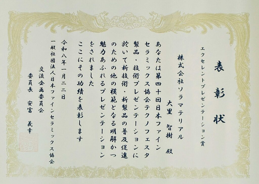 2026年1月22日(木)にベルサール御成門タワーにて開催された「第40回 JFCAテクノフェスタ・新春懇親会」(主催:一般財団法人ファインセラミックスセンター)において、**「JFCA エクセレントプレゼンター賞」**を受賞いたしました。